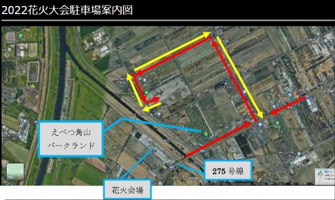 - 江別花火大会会場は、国道275号線沿い、角山パークランドの隣に位置しています。当日は、特に国道275