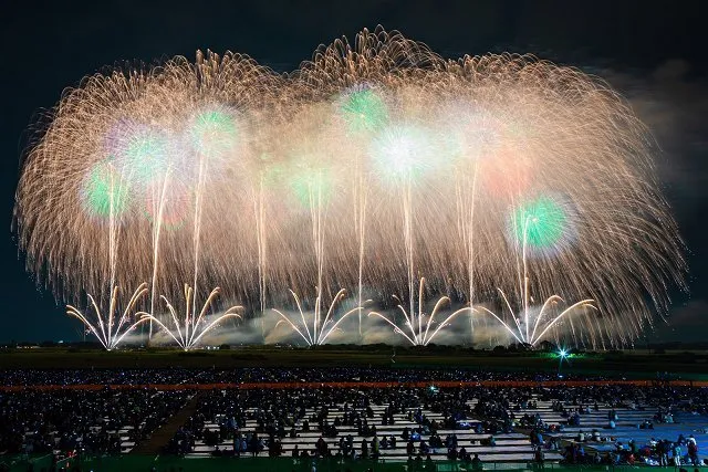 この大会では、直径約1.2メートルの巨大な4尺玉をはじめ、3尺玉も打ち上げられ、フィナーレには「日本一のラストスターマイン」と称される尺玉300連発の圧巻の演出が繰り広げられます。