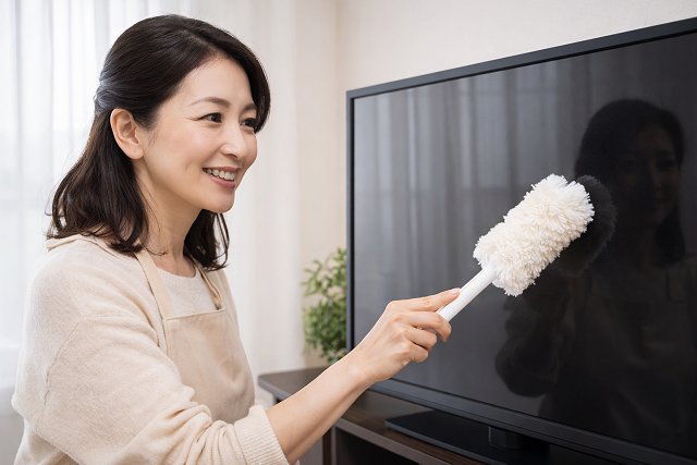 次に、テレビ画面の表面に付着したホコリを、ハンディーモップでやさしく払い落とします。毛足が長めのハンディーモップを使用すると、画面を傷つけにくく、ホコリも効率的に取り除くことができます。ただし、強く押し当てると内部の芯が画面に触れ、傷の原因となる恐れがあるため、力を入れず、なでるように動かすことがポイントです。