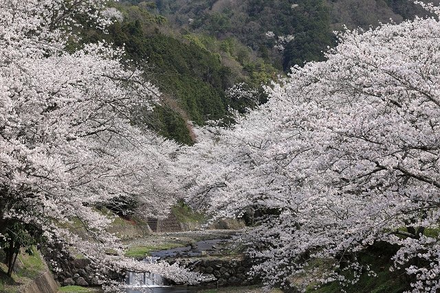 京都府亀岡市にある七谷川・和らぎの道は、春の訪れとともに約1キロに渡って約1500本の桜が美しく咲き誇る桜並木で知られています。この地域は丹波地方で最も有名な桜の名所として多くの観光客が集まります。隣接するさくら公園には28種類の桜が約280本植えられています。