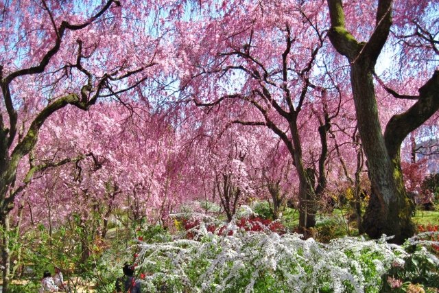 洛北の原谷に位置する個人所有の桜苑「原谷苑」は、代々の当主が愛情を込めて手入れを行ってきた木々や桜が植えられています。元々は私的な楽しみであったが、次第に評判が広がり、桜の季節には一般にも公開されるようになりました。この桜苑は、「京の桜の隠れ里」とも称されており、約4000坪の敷地内には20数種類、約450本の桜が植えられています。特に、樹齢70年を超える紅しだれ桜を含む約250本の桜が、3月下旬から4月中旬にかけて見頃を迎え、園内は濃いピンク色で覆われます。4月中旬から下旬にかけては遅咲きの桜も満開となり、長い期間にわたって静かで豪華な春の景色を楽しむことができます。