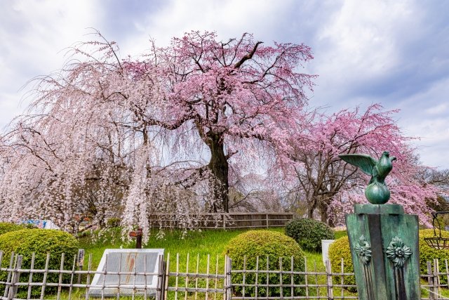 京都市内で最も古い円山公園は、回遊式日本庭園を中心に料亭や茶店が点在し、桜の名所としても非常に有名です。この公園は特に「祇園枝垂桜」として知られており、推定樹齢90年を超えるそのしだれ桜は、園のシンボルとして見る者を圧倒します。