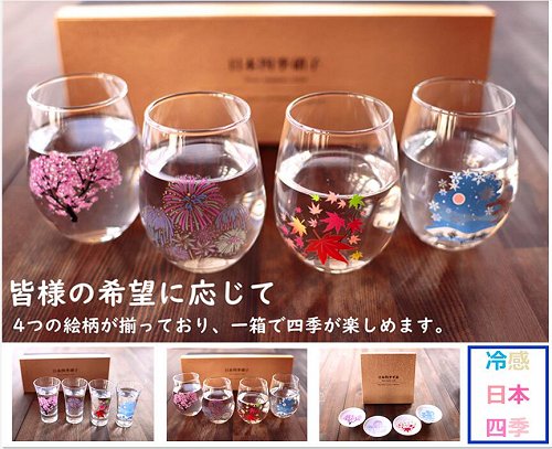 冷感日本四季フリーグラスでは、一箱で桜、花火、紅葉、雪結晶といった日本の四季の美しさを感じることができます。冷たい飲み物を注ぐと、色彩が鮮明に現れ、温度が約17℃以下になると色が変わる特別なグラスです。