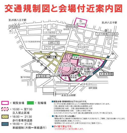 八王子花火大会では、花火大会当日、18:00〜21:30の時間帯に会場周辺道路で、交通規制が行われますので、ご注意下さい。
