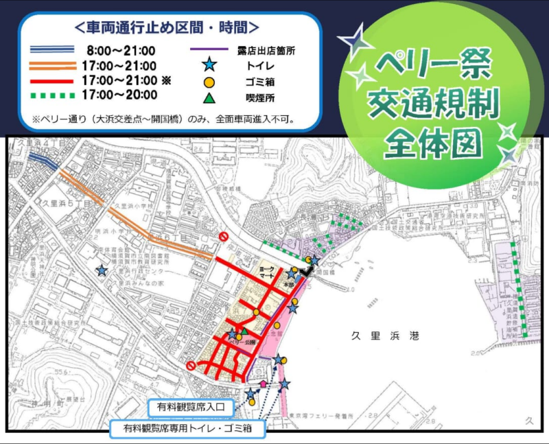 久里浜ペリー祭花火大会では、花火大会当日、17:00~21:00の時間帯に花火大会会場周辺道路にて交通規制(車両通行止め)が行われるます。会場へおこしの際には、ご注意下さい。