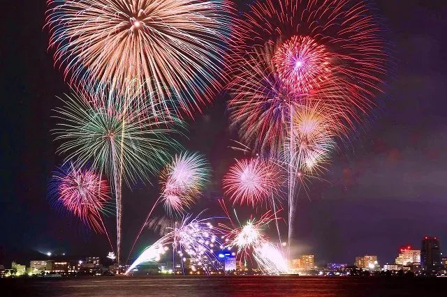 直径300メートルの尺玉が4発同時に並ぶ大規模なワイド演出や、水中花火、空中に広がるナイアガラ金銀大瀑布など、華やかで迫力ある花火が“水の都”松江の夜を鮮やかに彩ります。湖面には水と光が織りなす幻想的な光景が広がり、訪れる人々を魅了します。