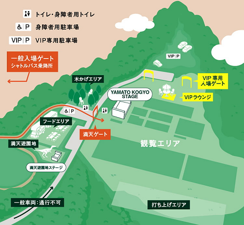 会場には地元グルメを堪能できるエリアや遊園地も併設され、家族や友人同士で一日中楽しめます。アクセスは徒歩禁止のため、無料シャトルバスまたは指定有料駐車場の利用が必須です。チケットは芝生エリア1万2千円からVIP席33万円まで用意され、VIPには専用ラウンジや駐車場特典が付きます。最新情報は公式サイトやSNSで随時発表されます。