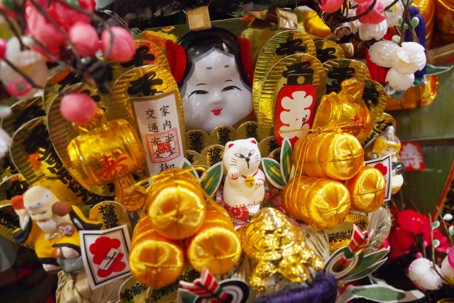 熊手をその年の「恵方」に向けて飾ると、福を招くとされています。
