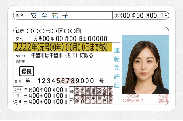運転免許を初めて取得すると、交付されるのはグリーン免許(有効期間部分の帯の色がグリーン)です。最初の3年間はこの状態となり、次回の更新時にブルー免許へ切り替わります。