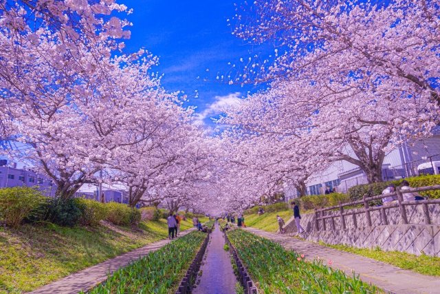 大岡川に沿った5キロメートルの大岡川プロムナードは、横浜市南区に位置しており、約500本の桜がこの地域を彩っています。このエリアは横浜市で最も有名な桜の名所の一つとして知られており、桜の季節にはぼんぼりでのライトアップが行われ、地域全体が華やかな雰囲気に包まれます。プロムナードを進むと、横浜弘明寺商店街があり、ここでは多くの名店が立ち並び、多くの訪問者で賑わいます。
