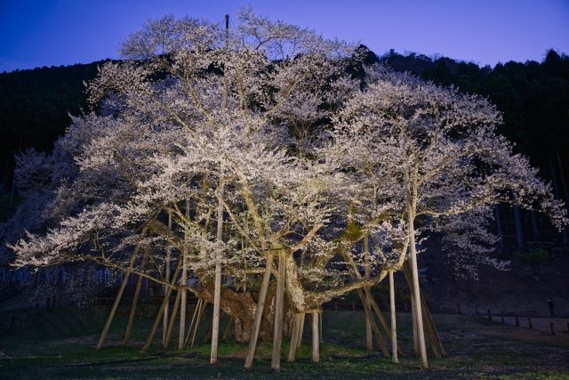 根尾谷の淡墨桜は、高さ約17.3メートル幹囲約9.4メートルの彼岸桜で、国の天然記念物にも指定されており、樹齢は1500年以上と推定されています。桜の花は毎年3月下旬から4月上旬にかけての見頃を迎え、2025年3月14日から4月20日の間、夜18時40分から21時までライトアップが行われます。