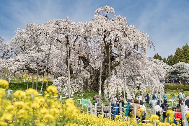 この桜は樹齢が1000年以上と推定され、樹高13.5メートル、東西に25メートル、南北に20メートルに及ぶ枝張りを誇ります。その壮大な枝は四方に広がり、真紅の小さな花が無数に咲き誇ります。この桜はその美しさから滝桜とも呼ばれ、水が滝のように流れ落ちる景色を作り出します。